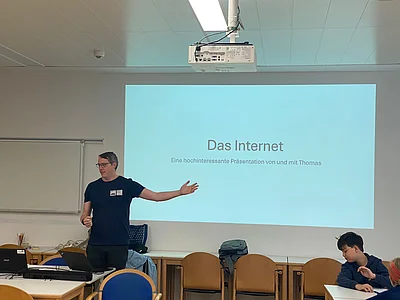 Zu Beginn führte Thomas die Kinder mit einer Präsentation in die Welt des Internets ein. Was passiert eigentlich, wenn man eine Website aufruft? Wie funktioniert WLAN? Und warum ist das Internet heutzutage so wichtig? Die Inhalte wurden bewusst einfach und spielerisch erklärt, damit alle Kinder mitkommen und verstehen, wie tief das Netz bereits in unserem Alltag verankert ist. Doch plötzlich passieren ganz komische Dinge. Der Bildschirm flackerte, die Maus bewegte sich wie von Geisterhand – ein unbekannter Hacker übernahm die Kontrolle über den Laptop.