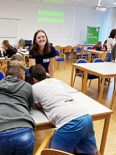 In 4er-Teams, mit selbstgewählten kreativen Namen, stellten sich die Kinder sechs interaktiven Stationen. Dort warteten unter anderem Bit der Netzwächter als Internet-Quiz, ein Puzzle, ein Minecraft-Labyrinth und weitere Challenges auf sie. Jede erfolgreich absolvierte Station brachte ein Teil-Passwort, welches ein wichtiges Puzzlestück für das große Finale darstellte.