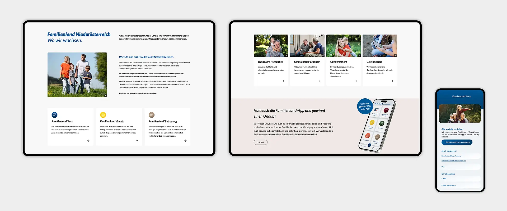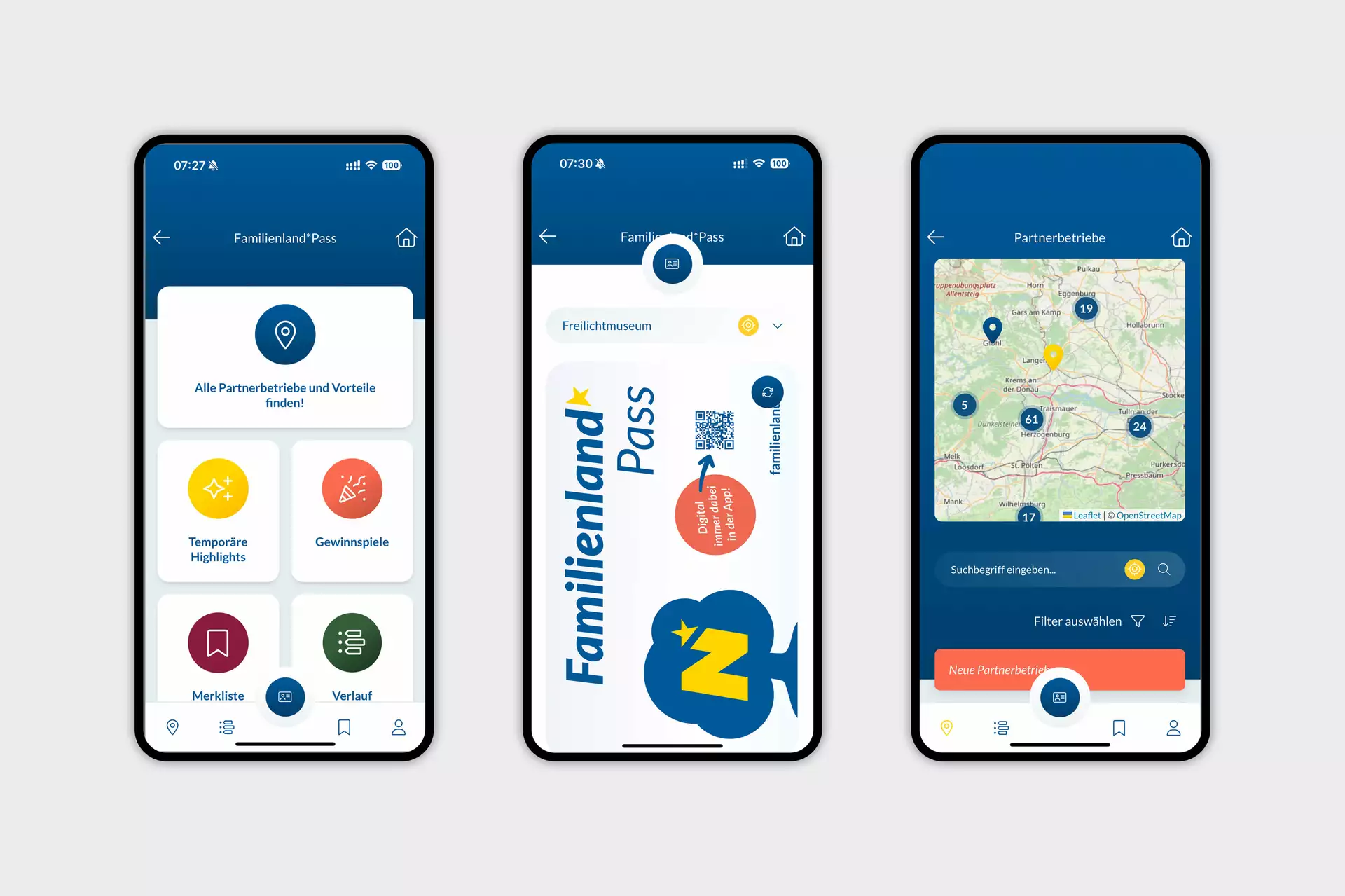Um dieses Serviceangebot digital und zukunftssicher abzubilden, wurde eine umfassende, mehrteilige Systemlandschaft entwickelt. Eine interne Nutzer:innenverwaltung für den Familienland*Pass, eine zentral gepflegte Website sowie eine mobile App mit eigenständigen Funktionen und Inhalten. Die Herausforderung lag dabei nicht nur in der technischen Umsetzung, sondern vor allem im strukturellen Zusammenspiel dieser Systeme. Parallel zu unserem Projekt erfolgte eine Umstrukturierung der Marke, deren Ergebnisse wir auch in unsere Struktur einfließen haben lassen.
