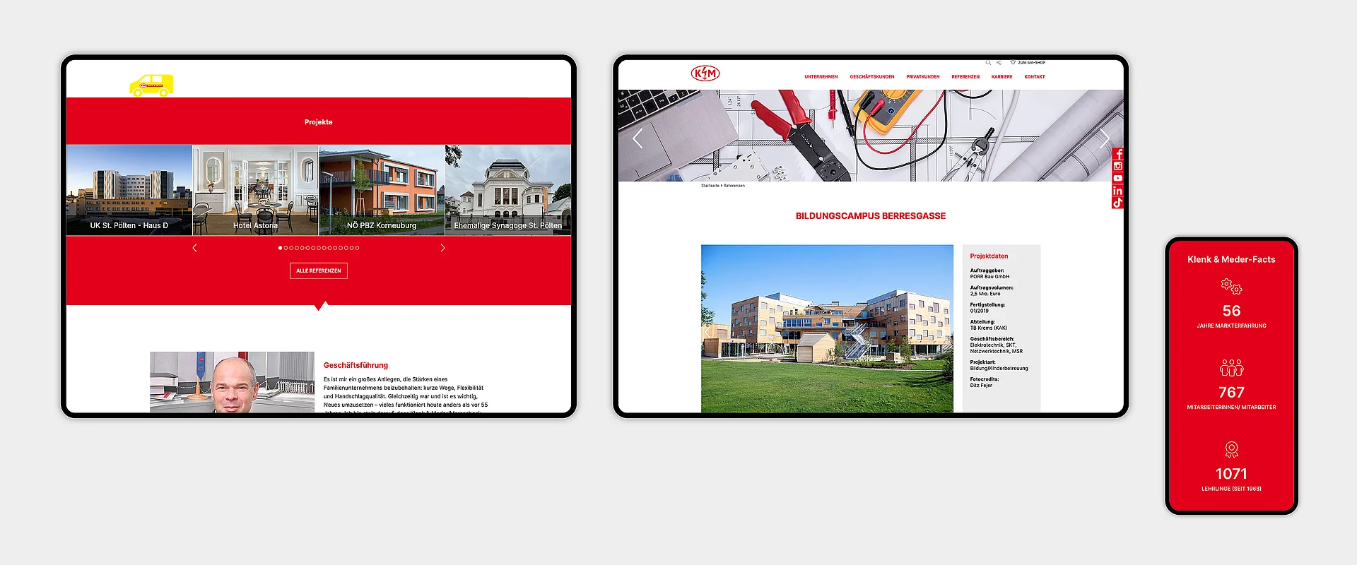 Die Zusammenarbeit mit Klenk & Meder besteht seit vielen Jahren, somit wurde die Website im Laufe der Zeit regelmäßig angepasst, um neue Inhalte und Anforderungen abzubilden. Beim letzten Update lag der Fokus auf der Überarbeitung der Startseite, der Referenz-Detailseiten sowie des Bereichs für Lehrlinge. Ziel war eine moderne und übersichtliche Gestaltung, die die Werte und Arbeitsweise von Klenk & Meder klar transportiert. Die neue Struktur sorgt für eine bessere Orientierung und stellt wichtige Inhalte klar in den Vordergrund.