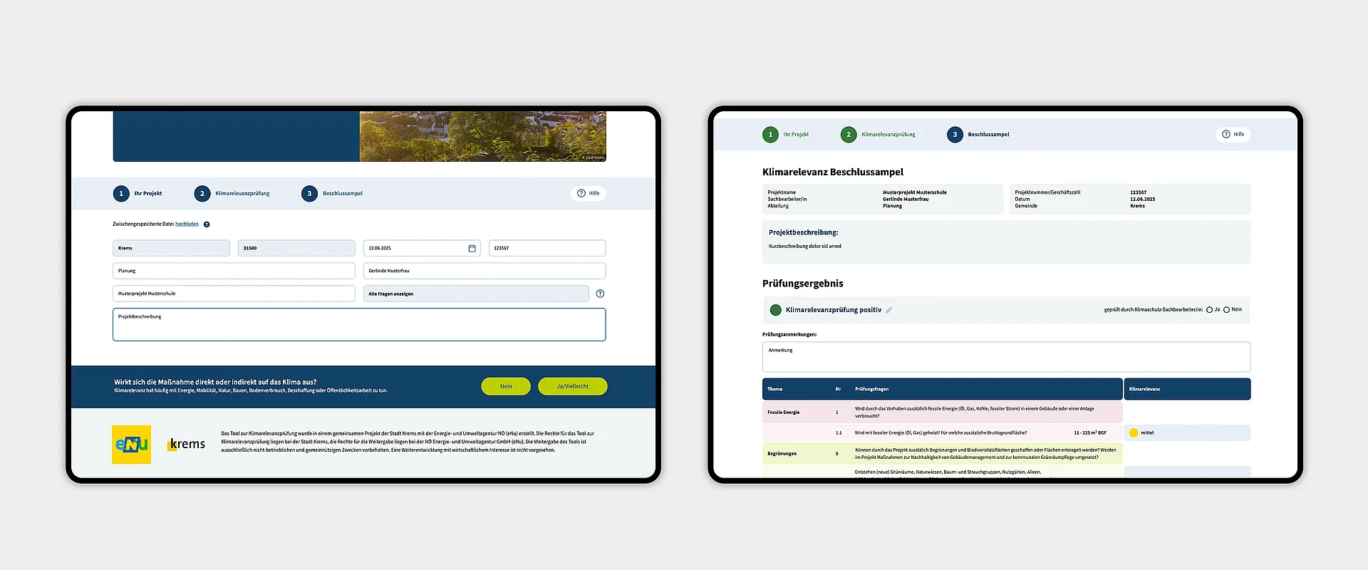 Um diesen Prozess benutzerfreundlicher zu gestalten haben wir dafür das Klimarelevanztool entwickelt und direkt in die neue Website integriert, die wir vor Kurzem umsetzen durften. Dieses Tool ermöglicht es Gemeinden, die Klimaauswirkungen geplanter Vorhaben schnell und fundiert zu prüfen und gezielt zu verbessern.